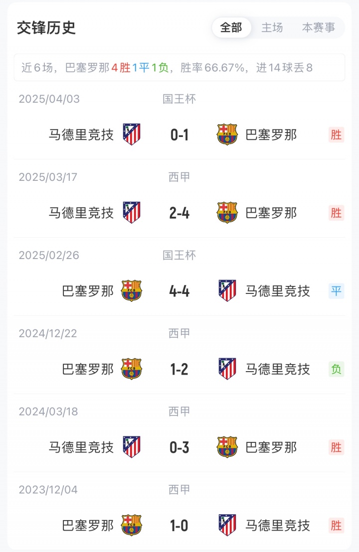 积分榜方面,巴萨11胜1平2负积34分暂位西甲榜首,近期收获联赛四连胜;马竞9胜4平1负积31分暂位西甲第四,各赛事七连胜。巴萨对阵马竞已连续3场不败(2胜1平)。