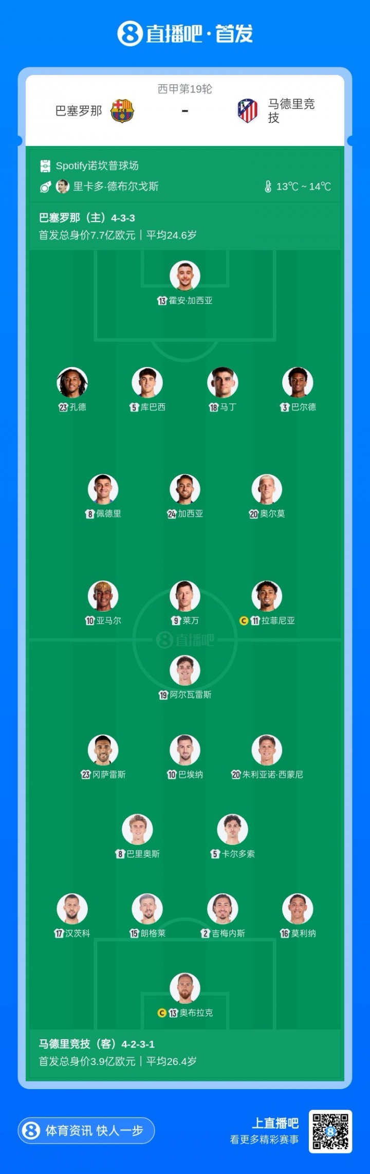 12月3日讯 西甲第19轮,巴塞罗那主场迎战马德里竞技,赛前双方首发公布!